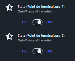 Le premier est state_l1 et state_l2, de type switch ou binary_sensor. Cela indique simplement si le canal 1 (L1) ou canal 2 (L2) est « on » ou « off ». Cela sert à créer des boutons virtuels sur votre dashboard HA pour allumer ou éteindre à distance depuis n’importe où. Par exemple, sur une carte dashboard personnalisée, vous voyez deux interrupteurs côte à côte : « Hotte cuisine L1 » et « Spots L2 ». Vous pouvez automatiser « à 23 heures, state_l2 passe à off », ou dire à voix haute « éteins L1 » via Google Assistant. Vous créez aussi des groupes comme « Cuisine tout off en un clic ». C’est l’essentiel pour le contrôle basique.