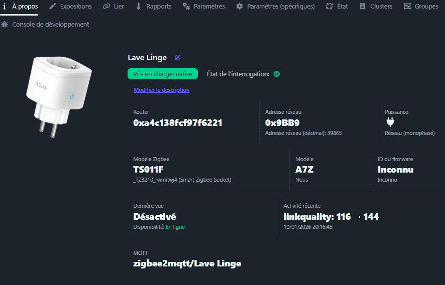 Linkquality indique la qualitĂ© du lien Zigbee entre la prise et le coordinateur ou le routeur associĂ©. La valeur est en gĂ©nĂ©ral entre 0 et 255, plus câest Ă©levĂ©, meilleure est la connexion. Si je vois une valeur basse persistante, je sais quâil peut ĂȘtre utile de rapprocher la prise, le coordinateur ou dâajouter un routeur Zigbee intermĂ©diaire.
