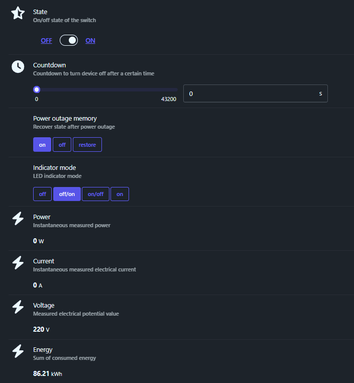 Power affiche la puissance instantanĂ©e en watts. Câest la consommation en direct de ce qui est branchĂ© sur la prise. Je mâen sers pour dĂ©tecter quâun appareil vient de dĂ©marrer ou de finir, en surveillant un seuil de puissance. La valeur change en temps rĂ©el quand la charge varie.
