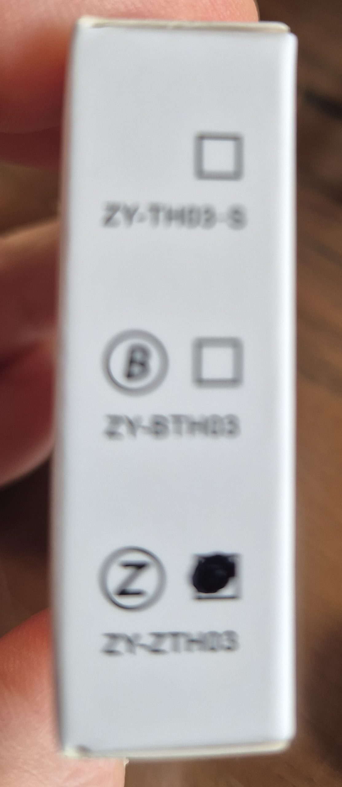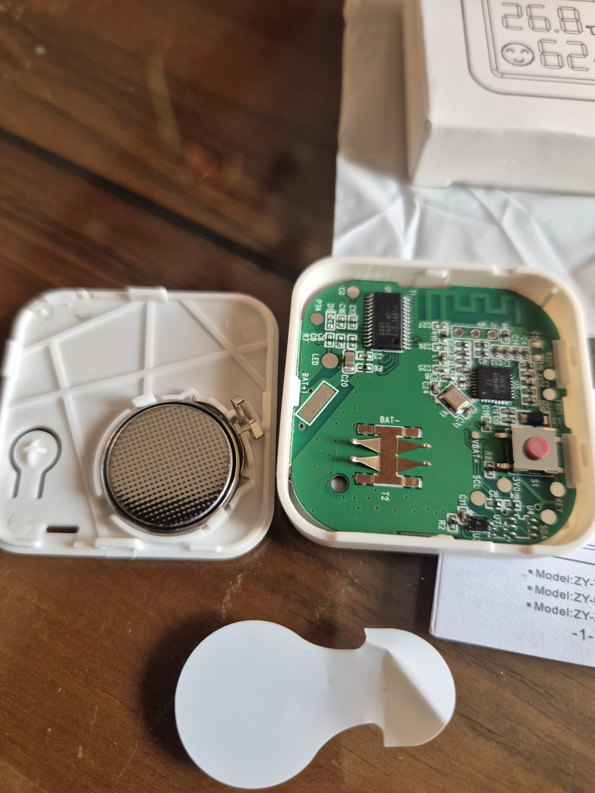 Je retire l’étiquette de la pile : l’écran affiche directement température et humidité, en bas à droite, un logo 🪢clignote pour dire qu’il tente de rejoindre le réseau Zigbee.
