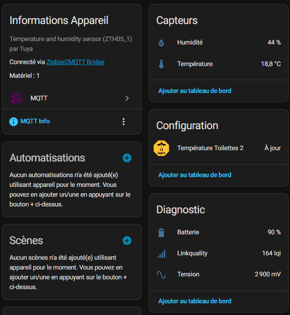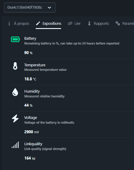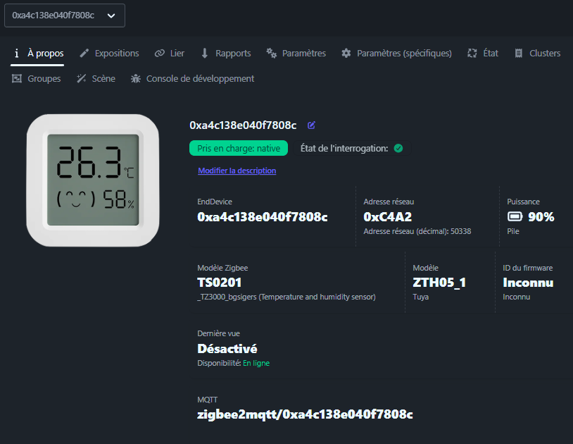 Le capteur est reconnu comme ZTH05_1 avec le modèle TS0201, un classique compatible. En principe sur ce type de produit, la batterie n’est pas affichée immédiatement, il faut souvent patienter 24h pour que la valeur apparaisse mais là, j’ai une valeur 90% / 2900mv, on verra si cela est une valeur réelle.