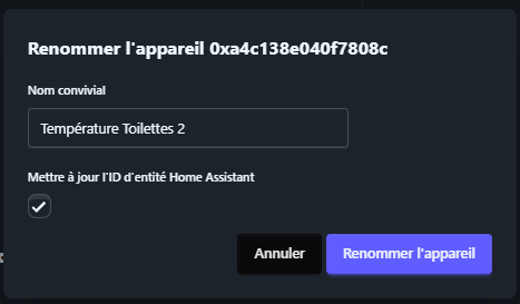 Tout fonctionne comme prévu. Avant de l’intégrer à Home Assistant, je le renomme pour m’y retrouver facilement dans mon interface domotique.