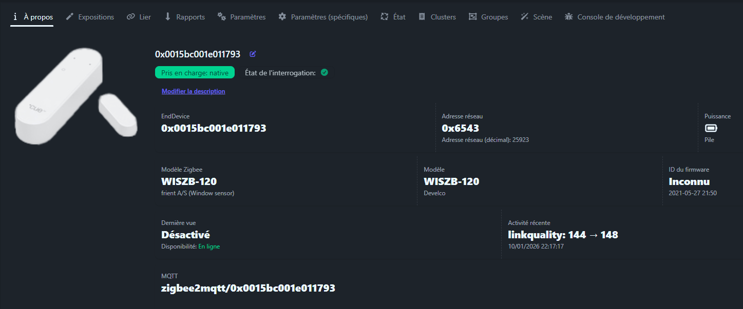 Voici les exposes du Frient Entry Sensor Pro WISZB-120 dans Zigbee2MQTT, capturés après appairage réussi. Ces données s’affichent en temps réel et alimentent directement Home Assistant. Je les détaille une par une avec leur rôle concret dans ma domotique.