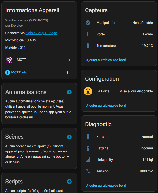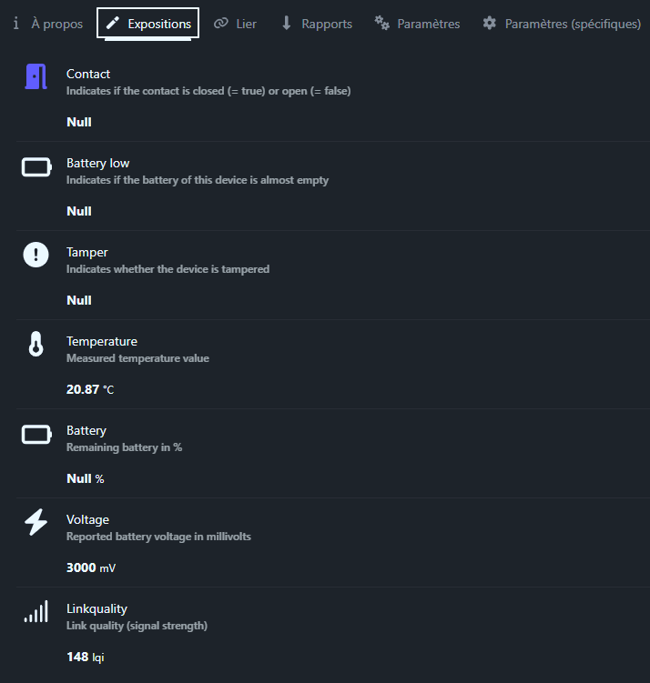 Contact indique l’état d’ouverture de la porte ou fenêtre. Quand la valeur passe à « open », cela signifie que l’aimant s’est éloigné du capteur. Quand elle est « closed », tout est normal. C’est cet état que j’utilise dans mes automatisations Home Assistant pour déclencher une alarme sonore ou une notification push si ouverture détectée la nuit.