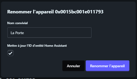 Avant de quitter Zigbee2MQTT, je renomme l’équipe en « La Porte ».