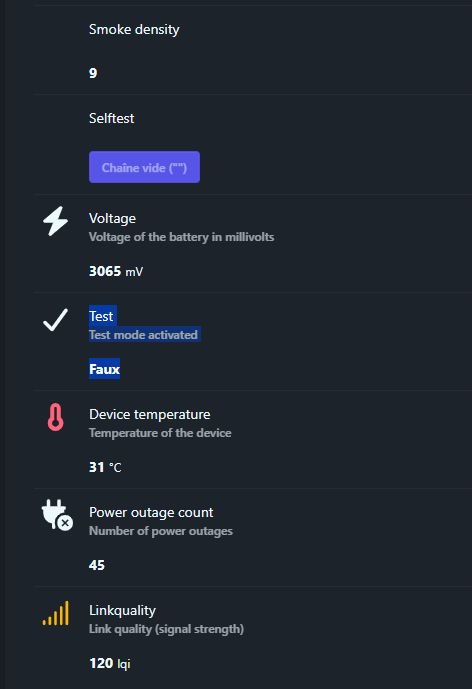 « Test » (Faux dans mon cas) indique si le mode test est actuellement activé sur le détecteur.