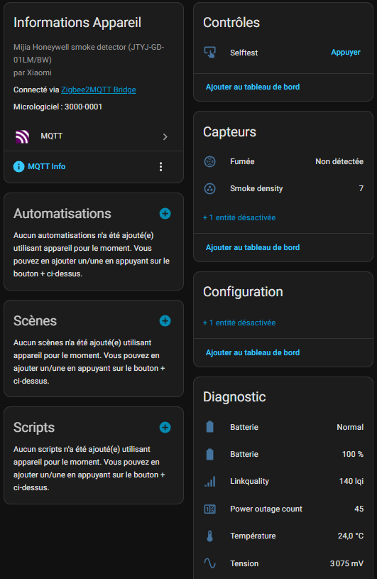 Dans Home Assistant, le détecteur apparaît automatiquement via l’intégration MQTT. État fumée, niveau batterie et tamper s’affichent tout de suite. Prêt en moins d’une minute sur mon dashboard.